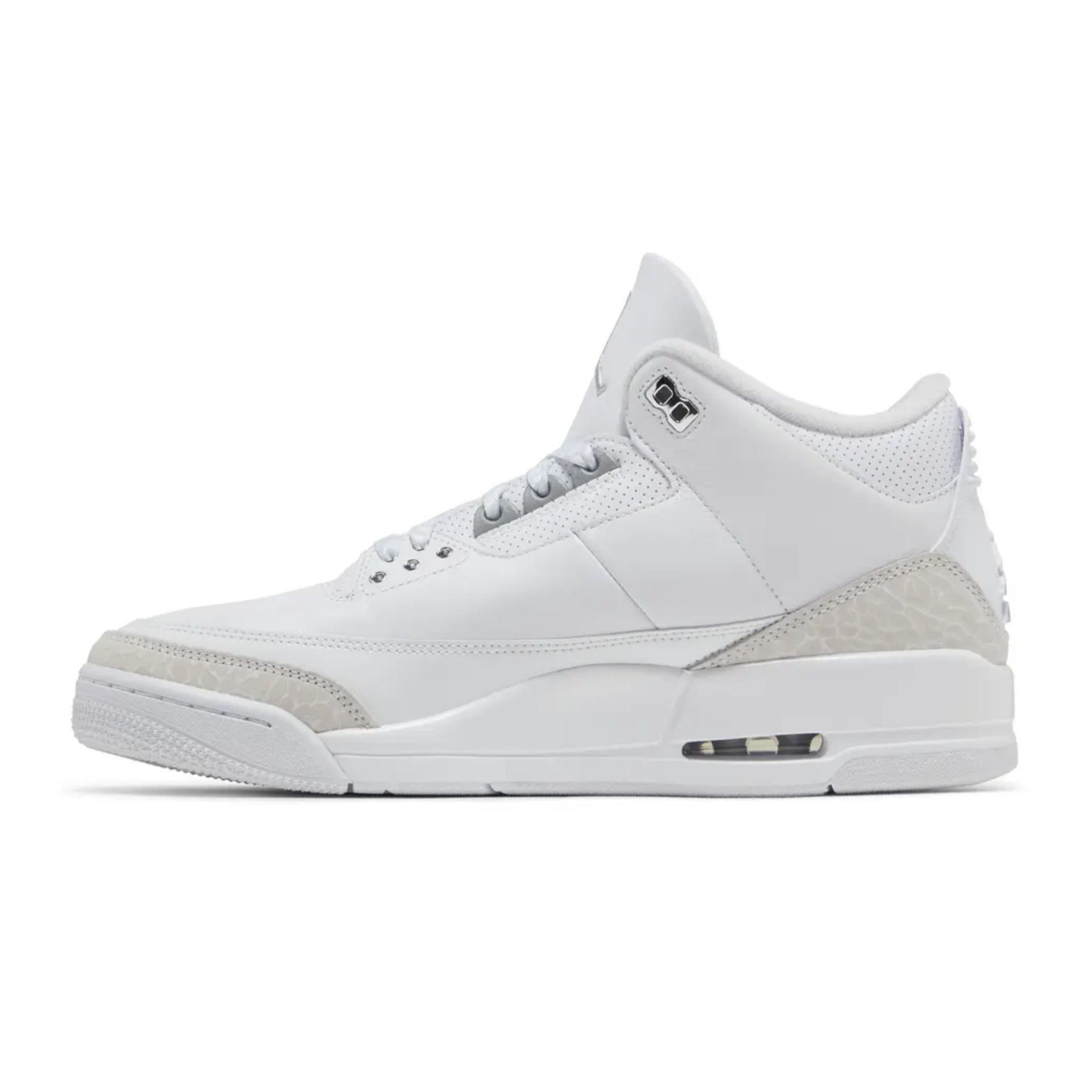 The Air Jordan 3 Retro "Pure Money" (2025) revives a fan-favourite classic with a clean, elevated look. Dressed in premium white tumbled leather with metallic silver accents, this edition stays true to the minimalist design that made the 2007 original so iconic. The signature elephant-print overlays, visible Air unit, and subtle “Pure $” embroidery behind the heel tab complete the luxurious aesthetic. Combining timeless style with Jordan heritage, the Pure Money 3s are the perfect blend of simplicity and sophistication — a must-have for collectors and everyday wear alike.