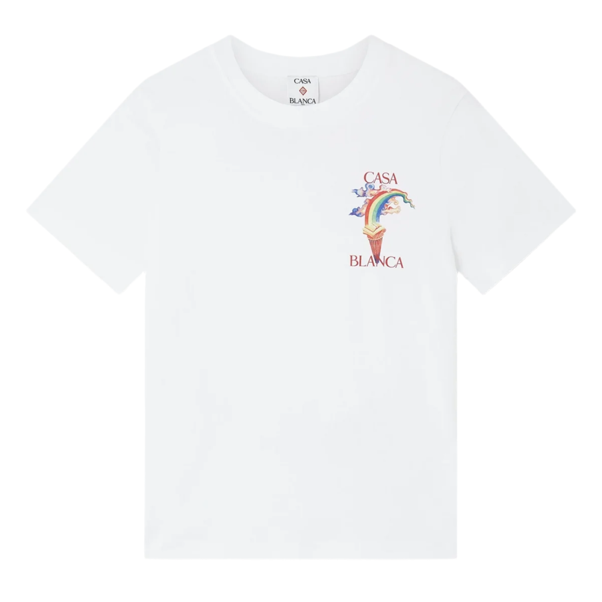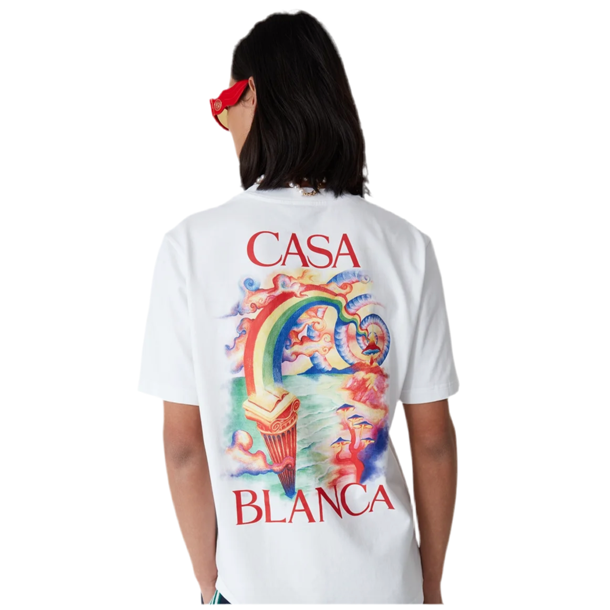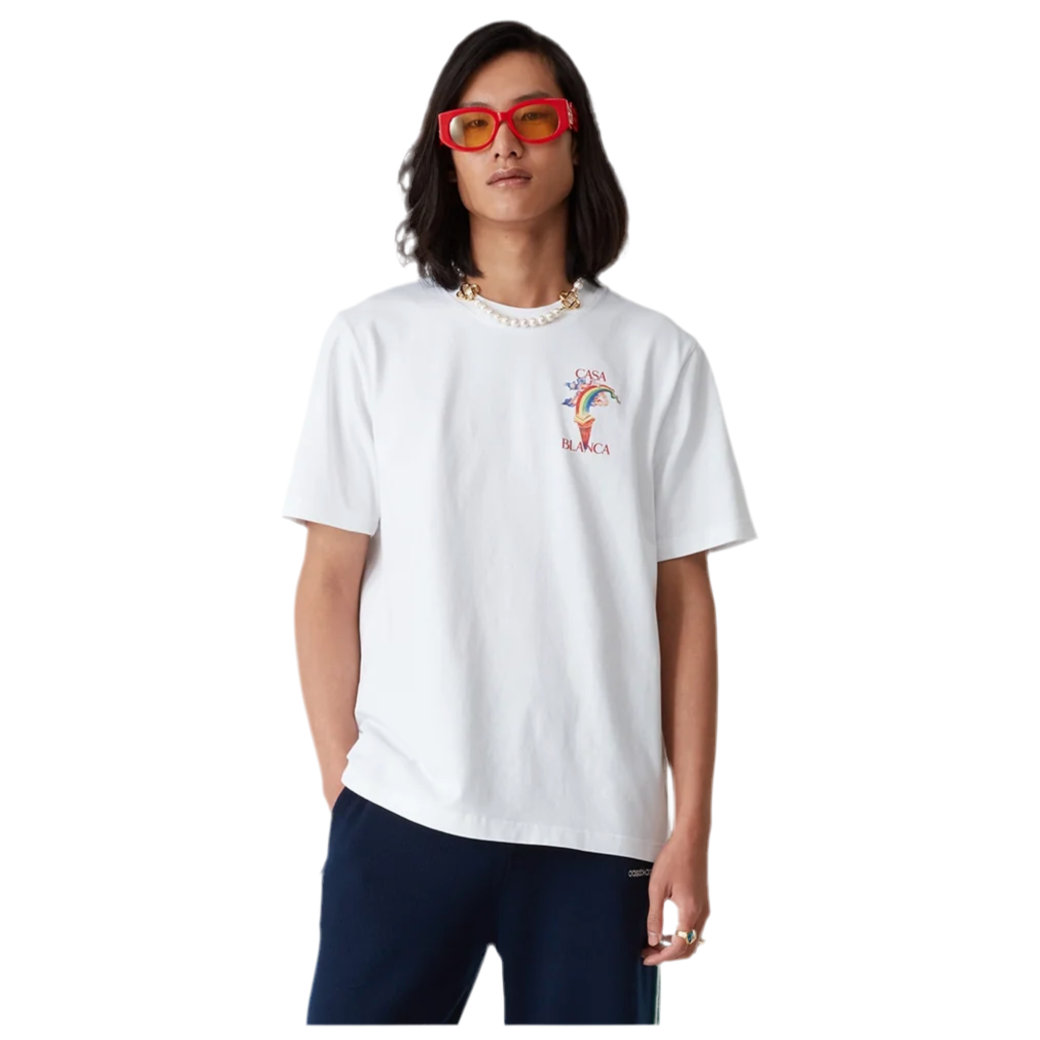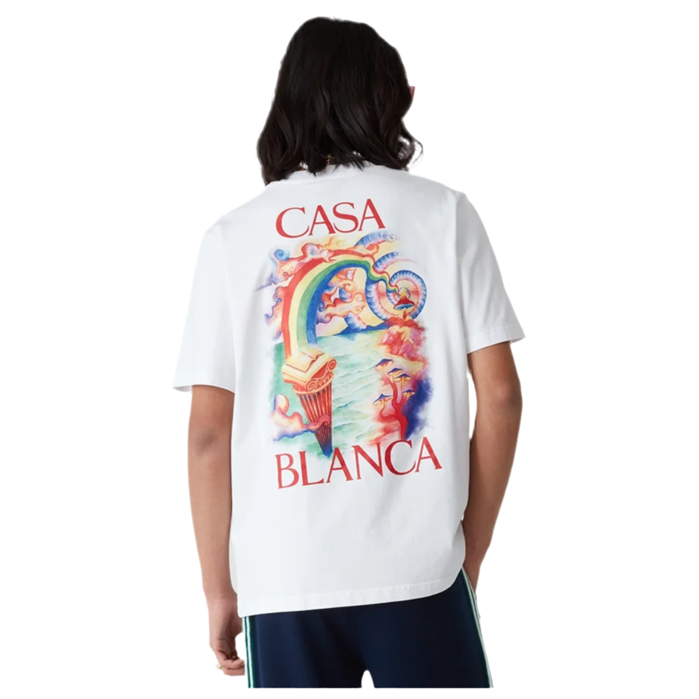 The Casablanca Nature's Teacher T-Shirt in White is a standout piece from the brand's collection, known for its vibrant and artistic designs. Crafted from 100% organic cotton, this short-sleeve tee features a bold, multicolour graphic on the front and back, reflecting Casablanca's unique fusion of art, culture, and high-end fashion. Made in Portugal, it offers a relaxed fit with a classic crew neck, ensuring both comfort and style.