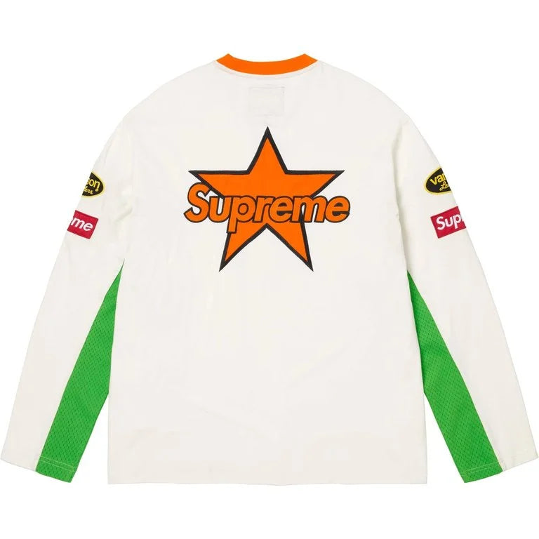 All cotton jersey with cotton mesh panels at chest and sleeves. Embroidered logo patches on chest and sleeves. Embroidered graphics on front and printed graphics on sleeves. Embroidered logo appliqué at back.